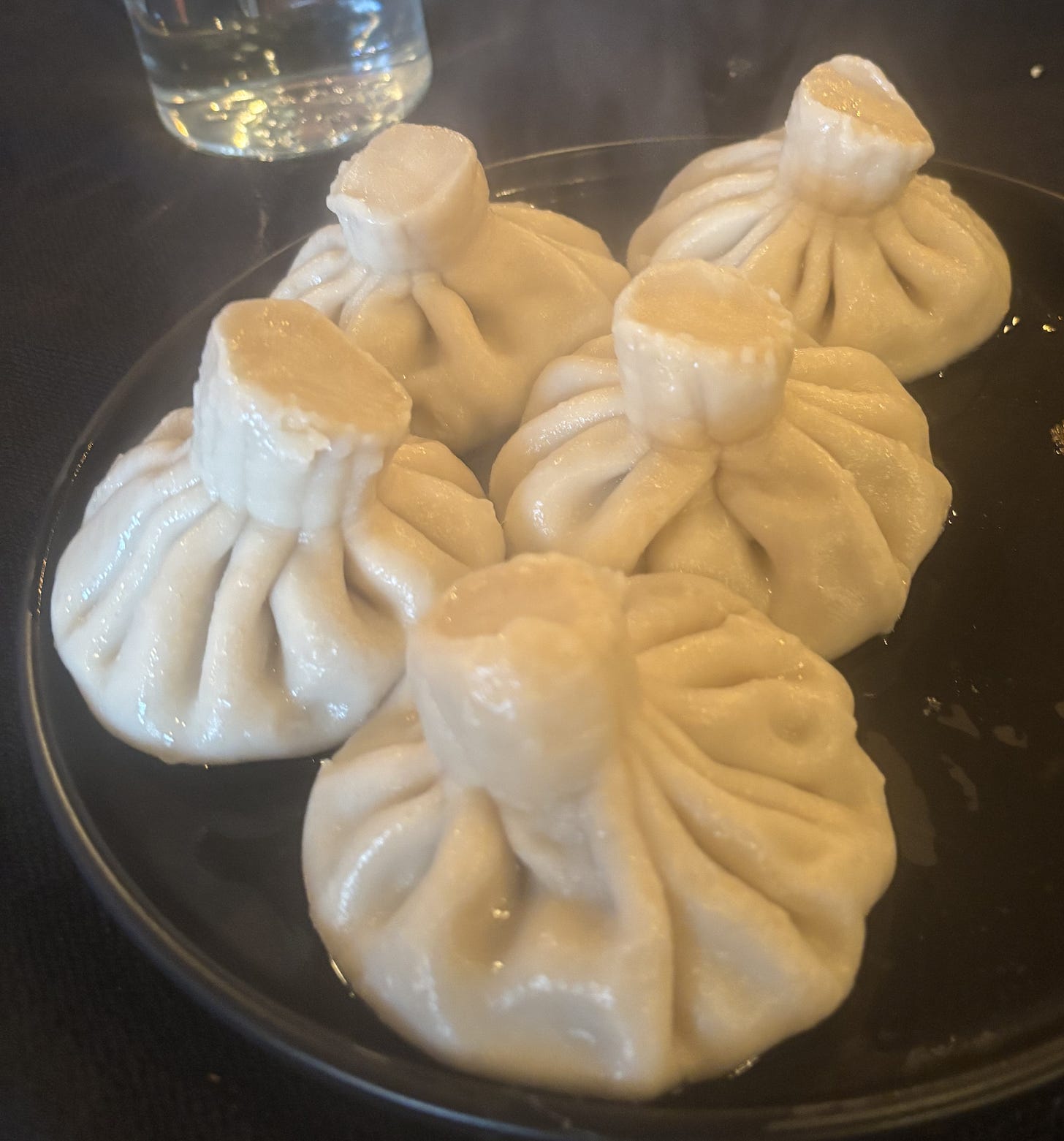 Khinkali: Boiled juicy dumplings filled with seasoned meat and herbs (These were much larger than we expected. We were told to eat them like a sandwich, but this resulted in the soup filling spilling out onto our plates.)