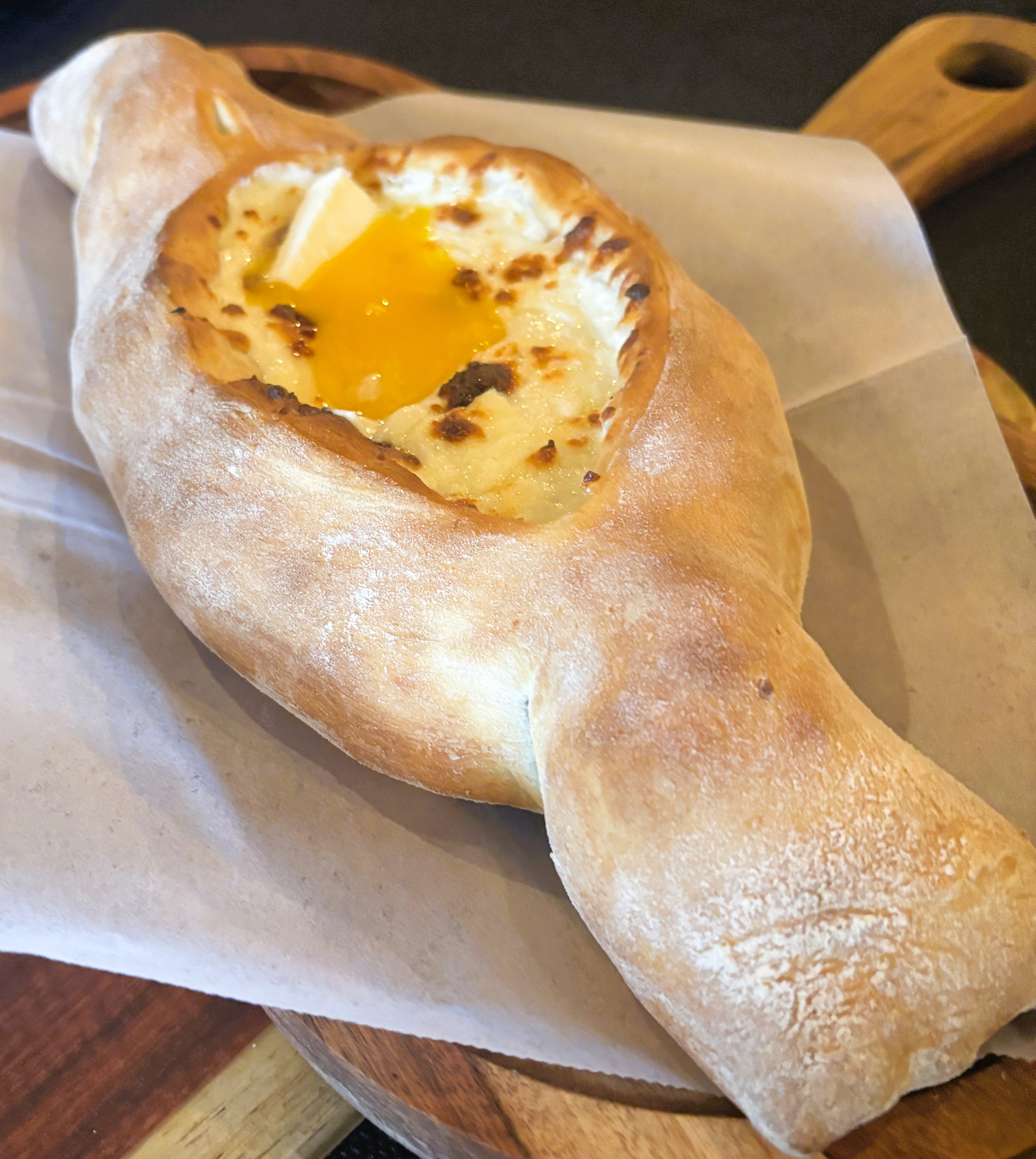 Adjarian Khachapuri: Bread stuffed with melted cheese and with egg on top (This is what we got although we actually ordered Imerelian Khachapuri: Feta & Mozzarella cheeses melted inside yogurt dough.)