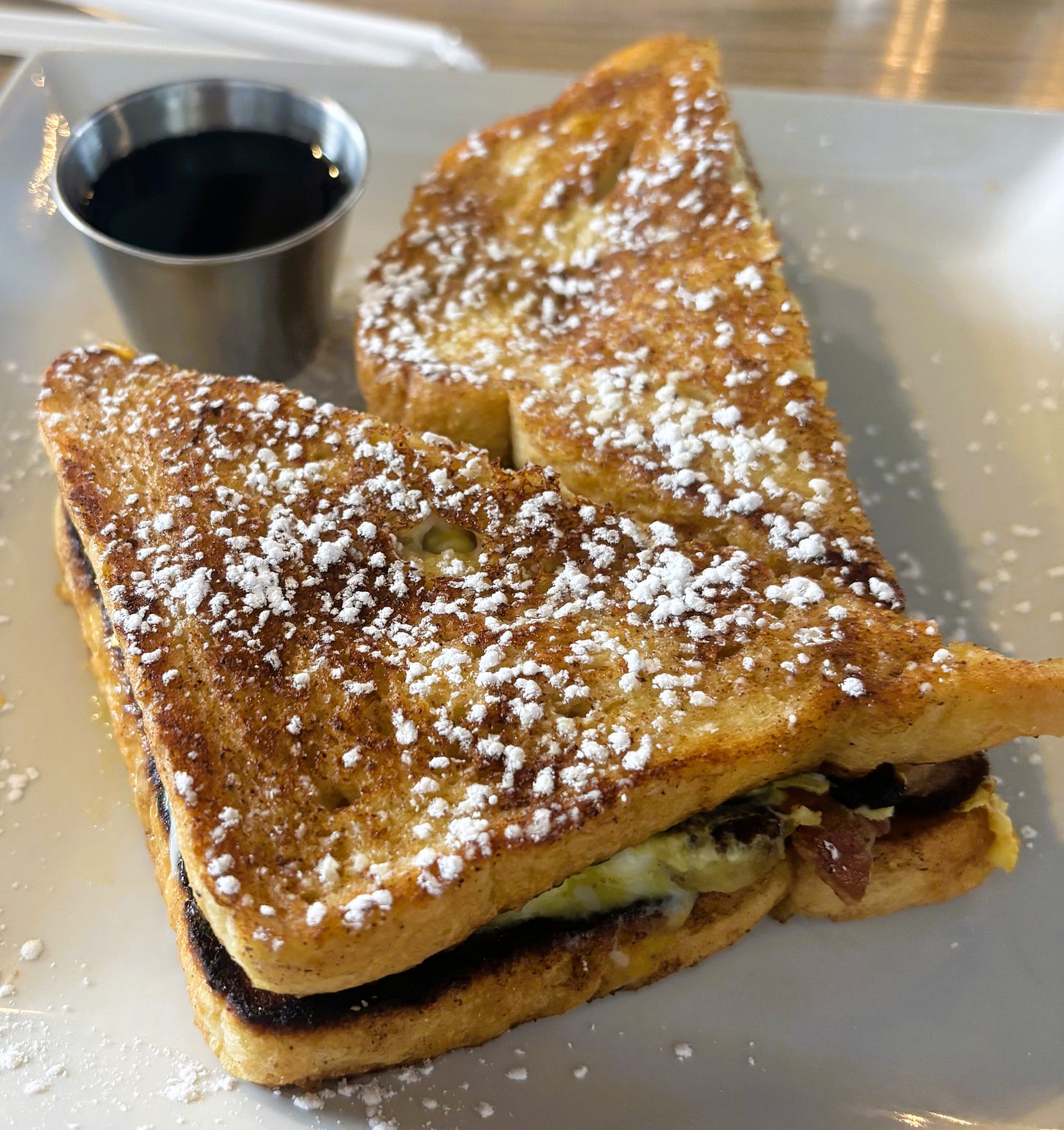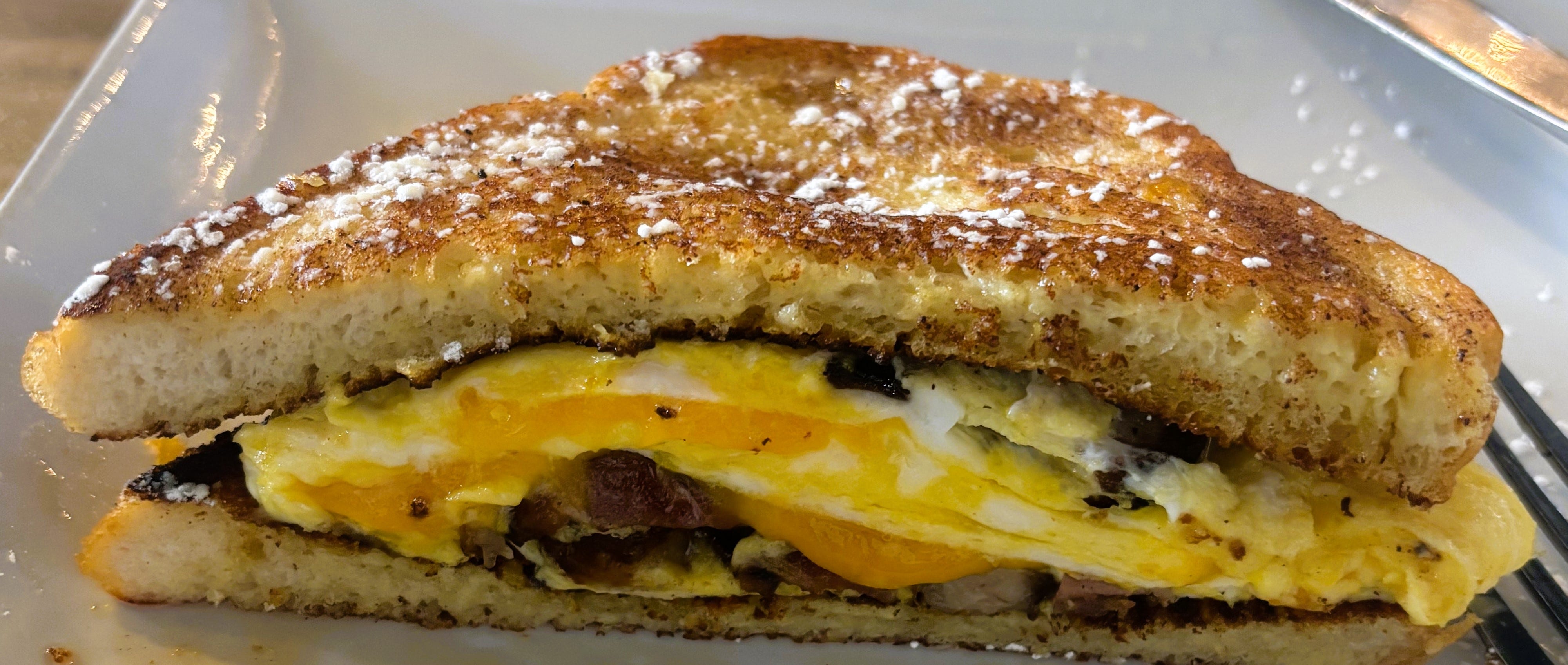 Incredible Delight: Two Slices of French Toast Stuffed with a Two Egg Omelette made with Bacon, Sausage, and Cheddar Cheese. All Topped with Powdered Sugar