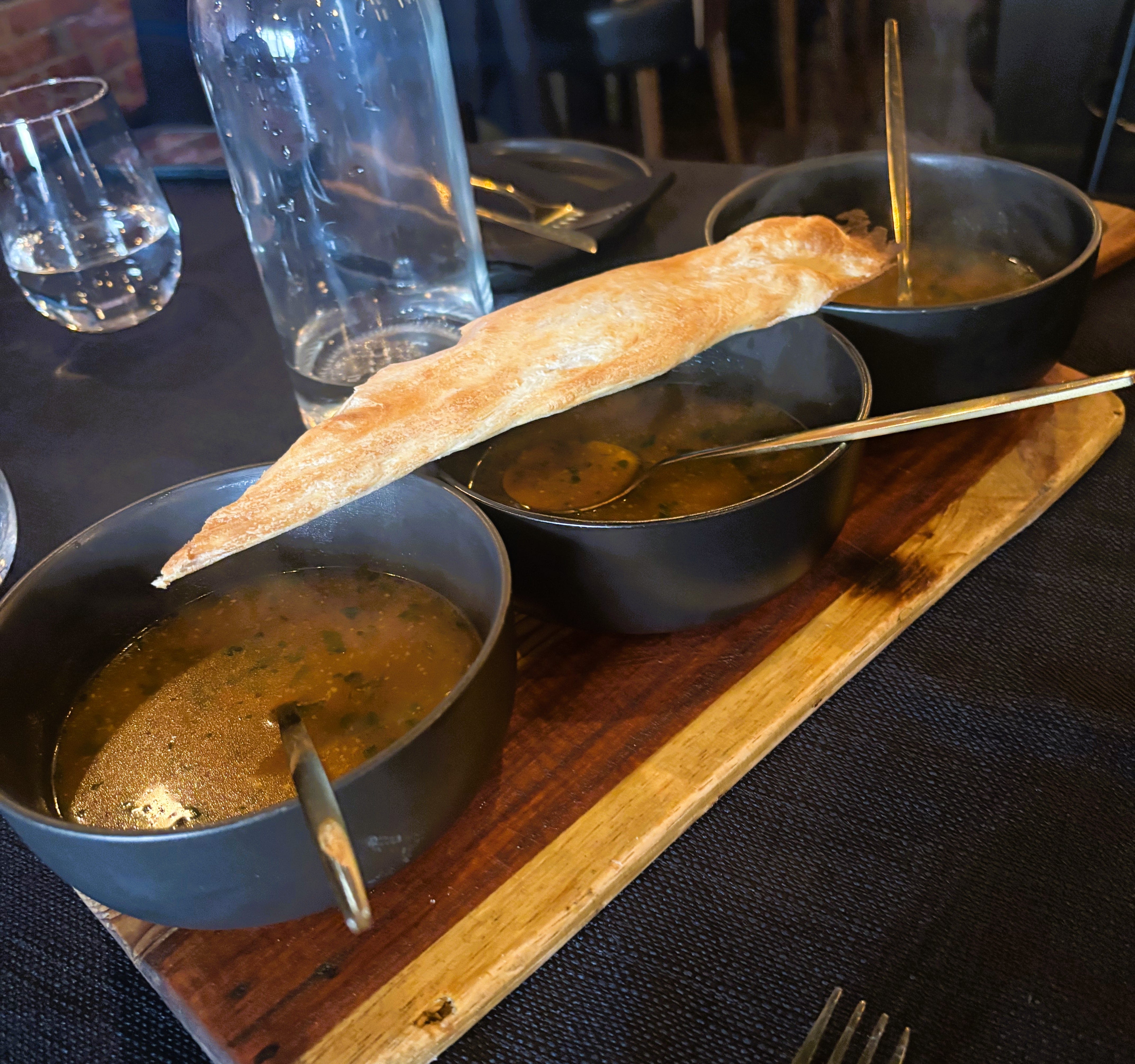 Chakapuli: Soup made with lamb slow cooked with tarragon, mint, scallions, parsley, and cilantro (This is what we got although we actually ordered Kharcho: A flavorful Georgian stew made with tender beef, rice, and tomatoes, slow-cooked with aromatic spices and herb.)