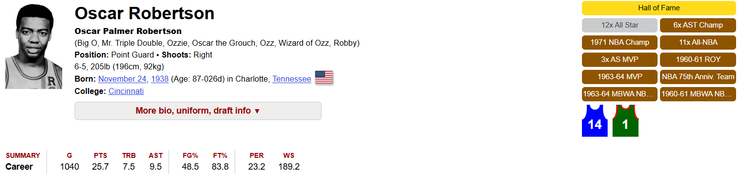 From Wikipedia: Oscar Palmer Robertson (born November 24, 1938 in Charlotte, Tennessee), nicknamed “the Big O”, is an American former professional basketball player who played for the Cincinnati Royals and Milwaukee Bucks in the National Basketball Association (NBA). As a 12-time All-Star, 11-time member of the All-NBA Team, and winner of the 1964 MVP, Robertson is considered to be one of the greatest point guards of all time. In 1962, he became the first player in NBA history to average a triple-double for a season (the only player in history besides Russell Westbrook and Nikola Jokić). In the 1970–71 NBA season, he was a key player on the team that brought the Bucks their first NBA title. His playing career, especially during high school and college, was plagued by racism.