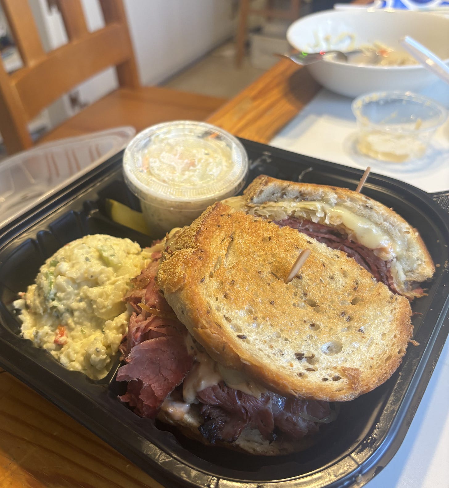 David placed an online order for me to pick up on my way to his house. Aside from the fact that half the order was initially missing and bagel chips were provided instead of the rye bread David had requested, the food was very good.