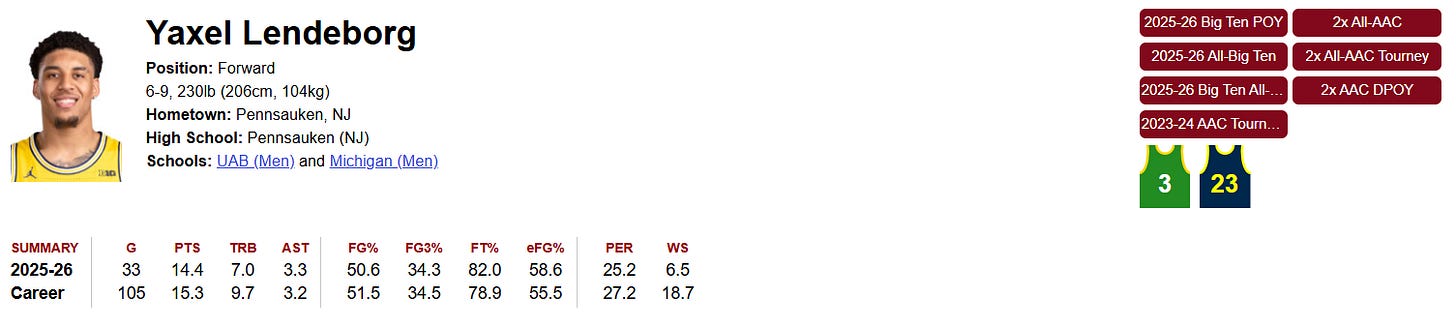 From Wikipedia: Yaxel Okari Lendeborg (born September 30, 2002) is an American-Dominican college basketball player for the Michigan Wolverines of the Big Ten Conference. He was an All-American and the Big Ten Player of the Year in 2026. Lendeborg previously played for the Arizona Western Matadors and UAB Blazers.