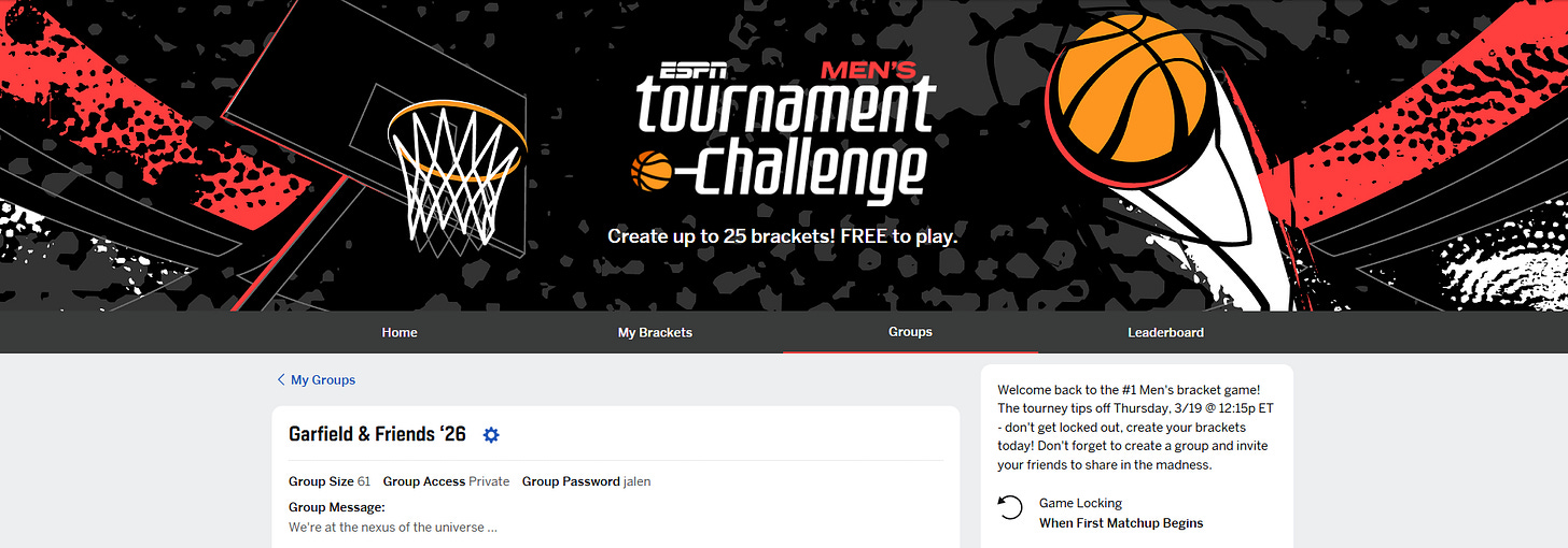 You are invited to join my son Roger’s Garfield & Friends 2026 March Madness bracket pool. I am the defending co-champion, and I hope to win for the fourth time.